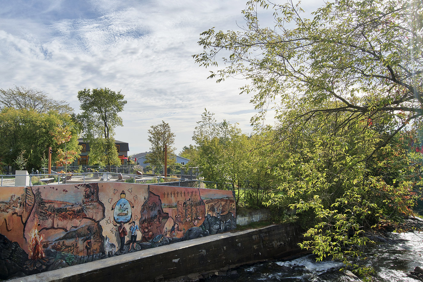 The Wendat People Fresco is located at Place de la Nation, on a wall near the Saint-Charles River, at the intersection of Bastien Boulevard.
