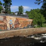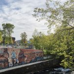 The Huron-Wendat Fresco is located at Place de la Nation, on a wall near the Saint-Charles River, at the intersection of Bastien Boulevard.